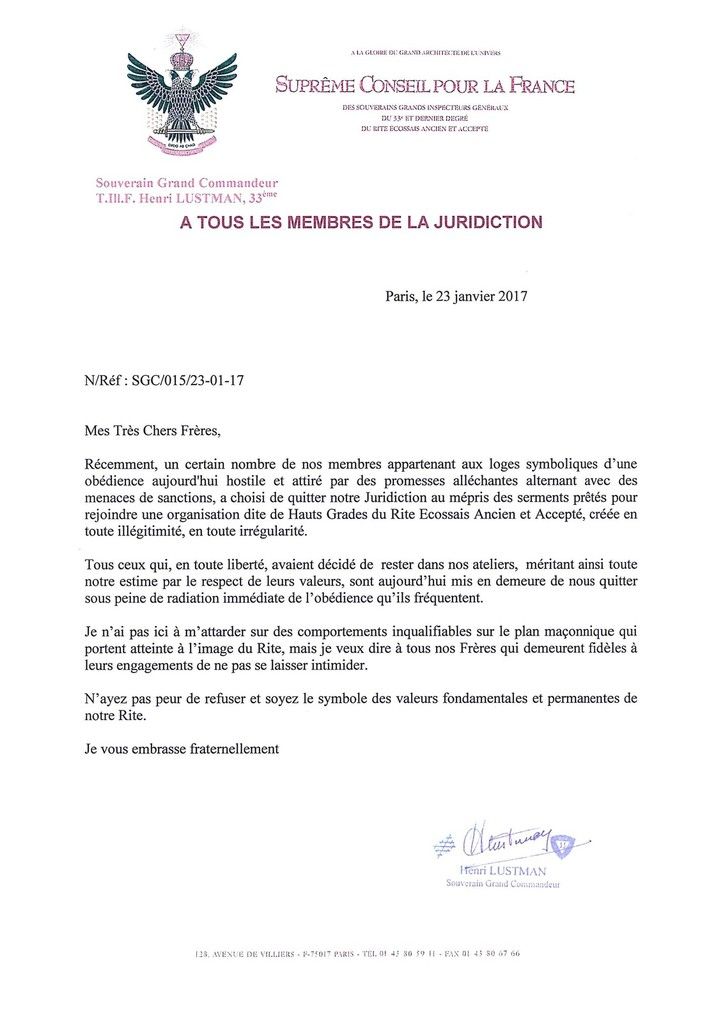 Alors que depuis son installation de Souverain Grand Commandeur du Suprême Conseil Pour La France du R.’.E.’.A.’.A.’. Henri Lustman faisait mine de vouloir trouver un accord avec Jacques Prats le Souverain Grand Commandeur du Suprême Conseil National De France, et même, curieusement, avec les dirigeants de la GLNF qui ne sont pas concernés par cette affaire, il s’est laissé aller à commettre une lettre circulaire destinée à tous ses membres dont le ton agressif et menaçant n’est pas sans rappeler le style stifanien de la pire époque.
